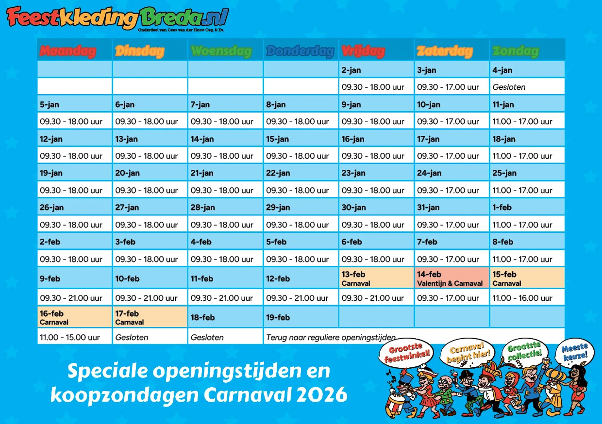 Of je nu meedoet aan een optocht, een themafeest bezoekt of iets zoekt voor een schoolfeest of bedrijfsborrel: FeestkledingBreda.nl helpt je graag aan een originele en feestelijke outfit.