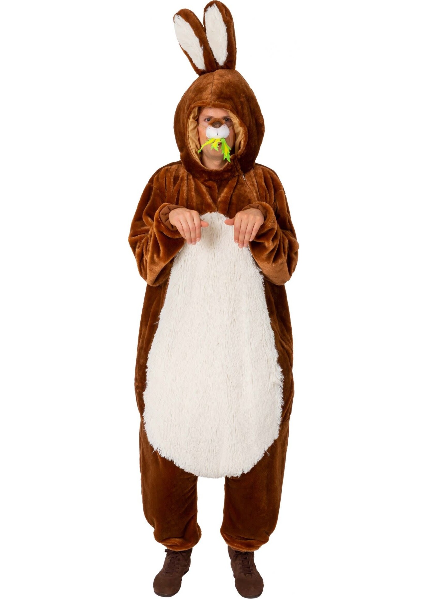 Dit haaskostuum met losse neus is de perfecte keuze voor themafeesten, carnaval of paasvieringen. Dit kostuum bestaat uit een pluchen bruin pak met een wit buikgedeelte en een schattig staartje. De kop heeft grote oren deze zorgen voor een authentieke haas-look, terwijl de losse neus het geheel compleet maakt. Dankzij de ritssluiting aan de voorzijde is het kostuum eenvoudig aan en uit te trekken. Het kostuum is ontworpen voor een comfortabele pasvorm en is geschikt voor volwassenen van 175cm - 190cm.